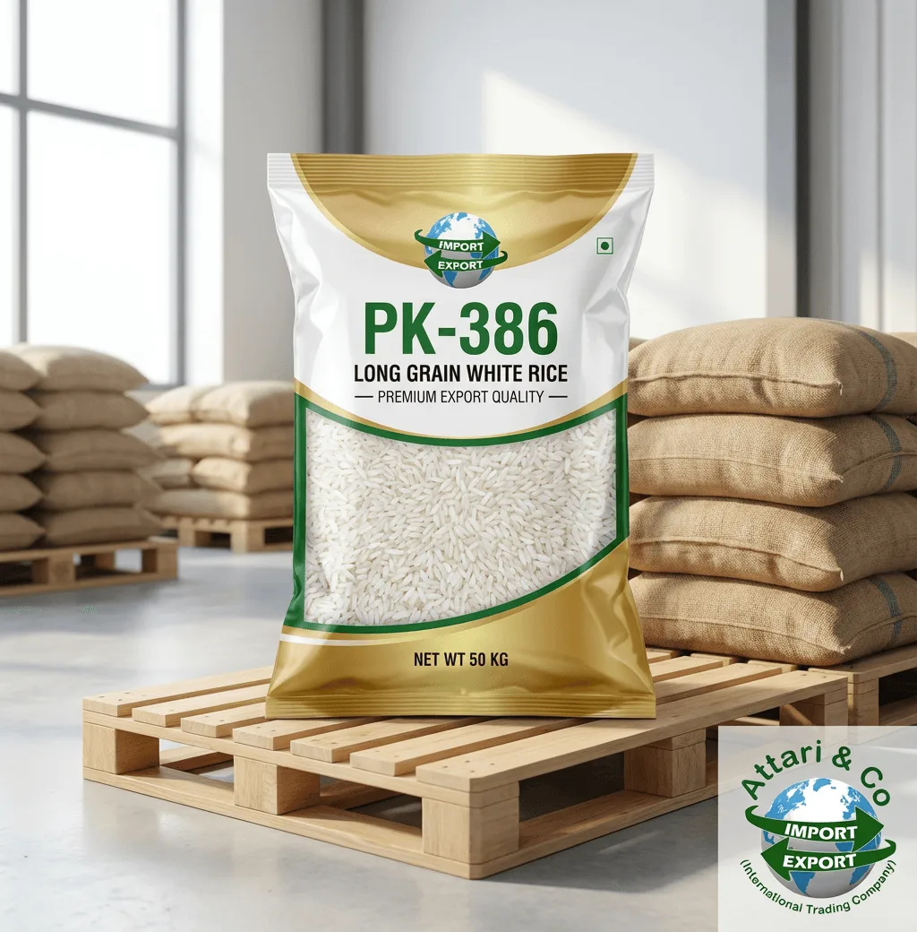 PK-386 Rice is a well-known Pakistani long-grain variety valued for its uniform grains, good elongation, and soft texture after cooking. Attari & Co supplies PK-386 rice that is carefully milled, sorted, and hygienically packed to meet export standards.